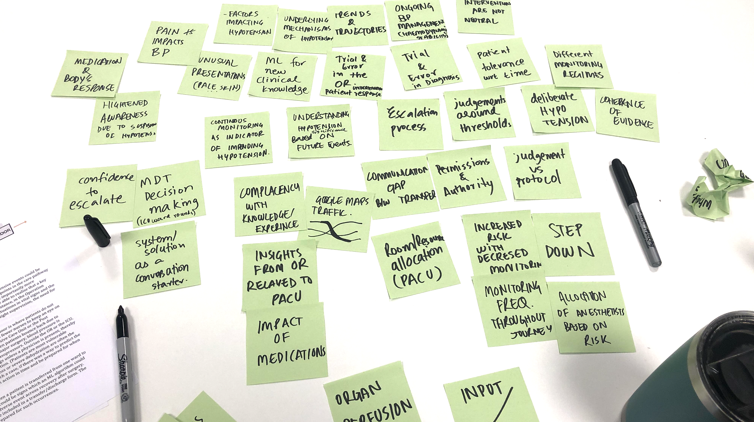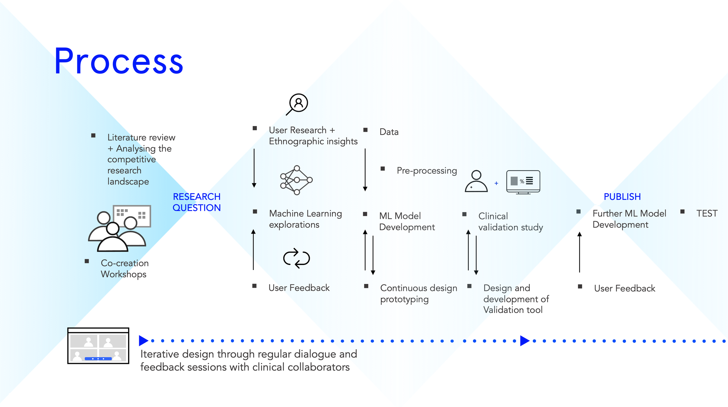 Below is a map of what the overall process looked like. We started with literature reviews and put together a competitive landscape of ML for adverse event prediction. Through co-creation workshops, we narrowed down on the research question before embarking on user research and ethnography.