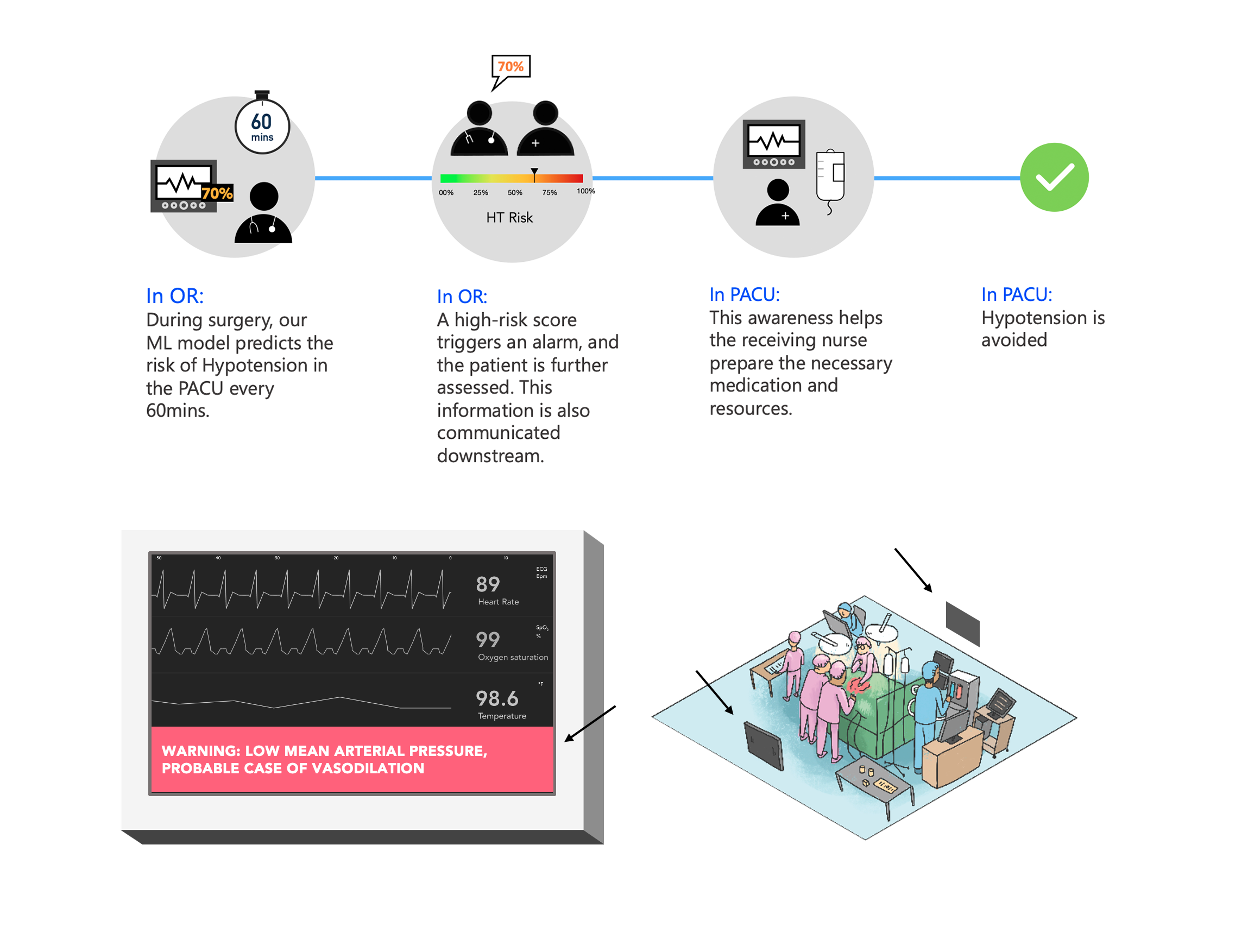 One of the experiences we decided to realise was around the transition of a patient moving from the OR to the PACU. At the end of the surgery in the OR, our model would predict the risk of hypotension in the next phase- the PACU. This risk would be shown to the Anaesthesiologist on an accessible computer who then would call up the PACU nurse and inform them of any special requirements. This could be keeping certain medications at hand or monitoring the patient more frequently. or assigning an extra nurse. So, by providing predictive insights at the right time at the right place, we would have a way better chance of avoiding hypotension.