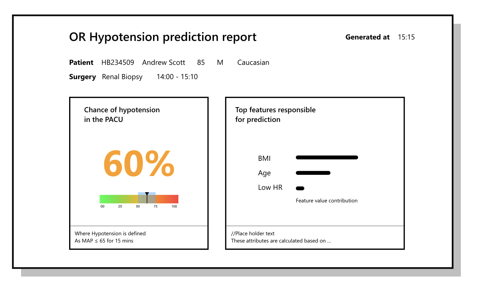 While the infographics below might not look like much, in a hospital setting, you want to strip away as much embellishment as possible from the design for quick readability leading to efficient action. By way of several iterations and user feedback, we decided to go with a minimal design that highlights the chance of hypotension. Underneath, we show the margin of confidence.