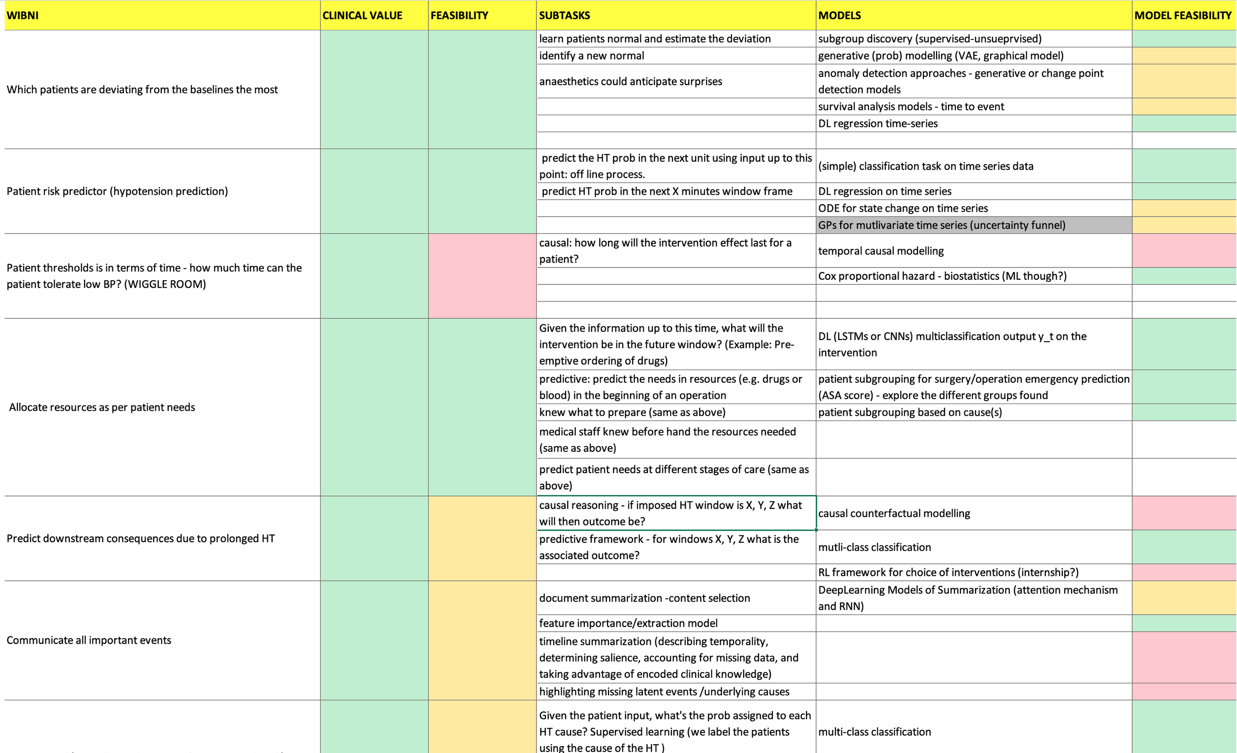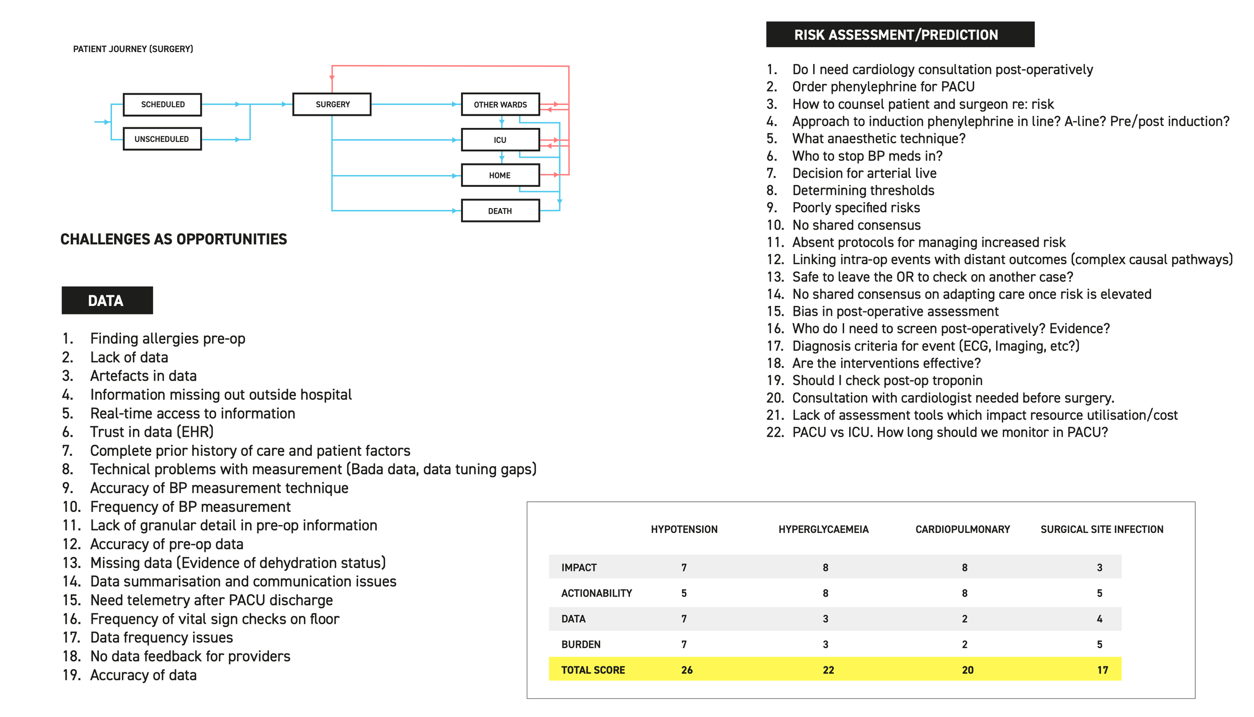 We knew our collaborators and had some idea of the challenges which predictive analytics could solve. By way of workshops, we realised the importance of solving these problems in relation to each other. And hypotension was the winner! Through these sessions, we identified various challenges on the patient journey map and got the participants to vote on them based on key attributes such as impact, actionability, data availability and patient burden.