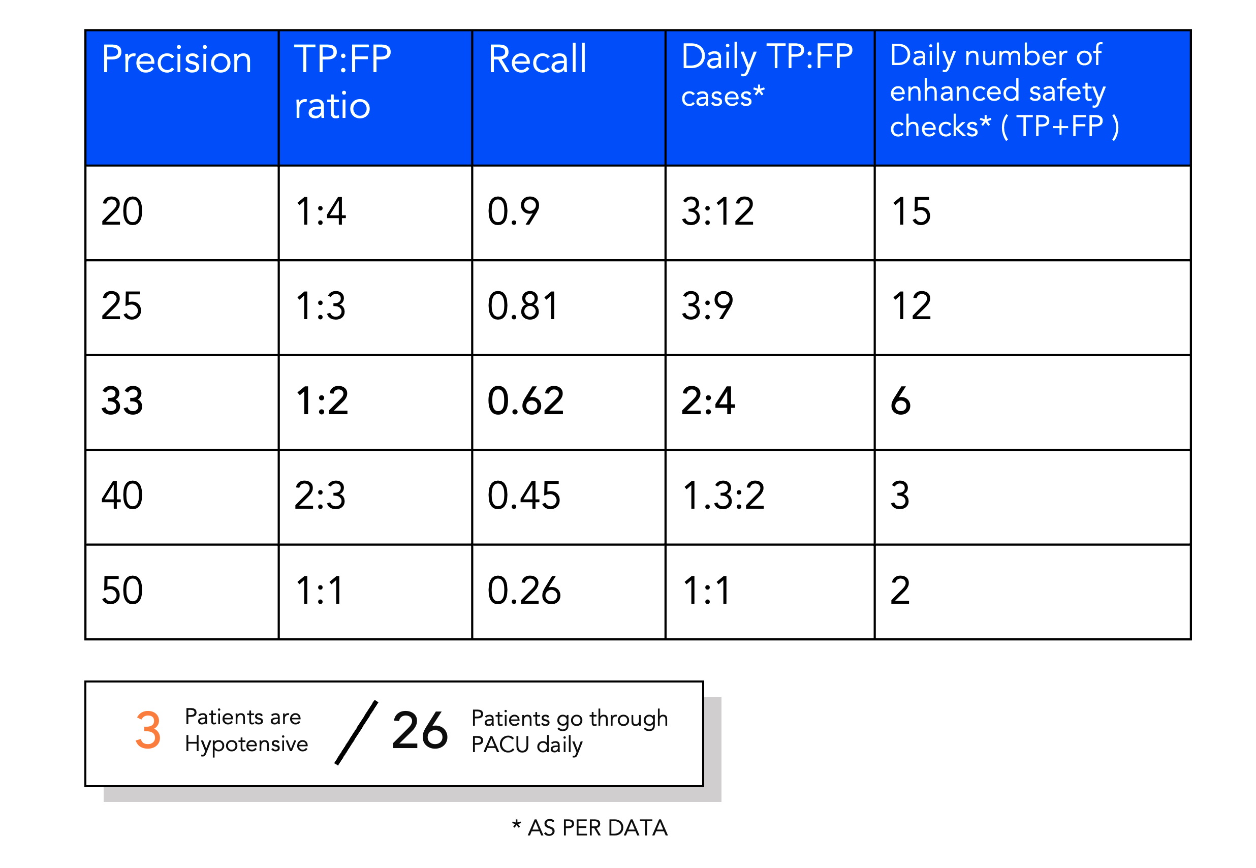 From looking at the data, we knew that on an average, there are 26 patients who go through the PACU. My ML colleagues played around with the sensitivity of the model and we took this back to our clinical collaborators to understand what is the appetite for alarms and additional safety checks in their busy schedule. What is the cost of a False Positive? If a prediction is positive, what would the enhanced safety check look like? These are the kind of questions we raised with our users.