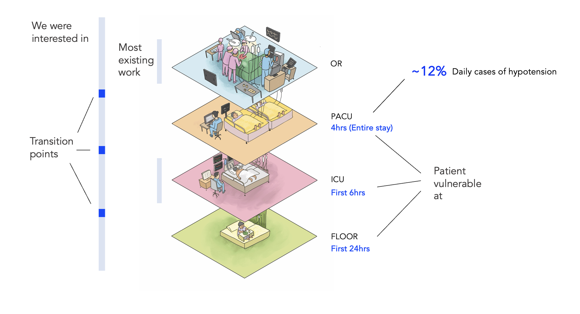 A patient goes through multiple wards during their stay at the hospital. While existing literature on ML based prediction was mostly situated in the ICU (likely due to easily available high-fidelity data), user research revealed that points at which a patient is most vulnerable are: First 4 hrs in the PACU, first 6 hrs in the ICU and first 24 hrs on the general ward. This was finding was further backed up by looking at the anonymised patient flow data which was made available to us for analysis. More than 12% of patients who go through PACU, become hypotensive and need escalation. ๐คฏ