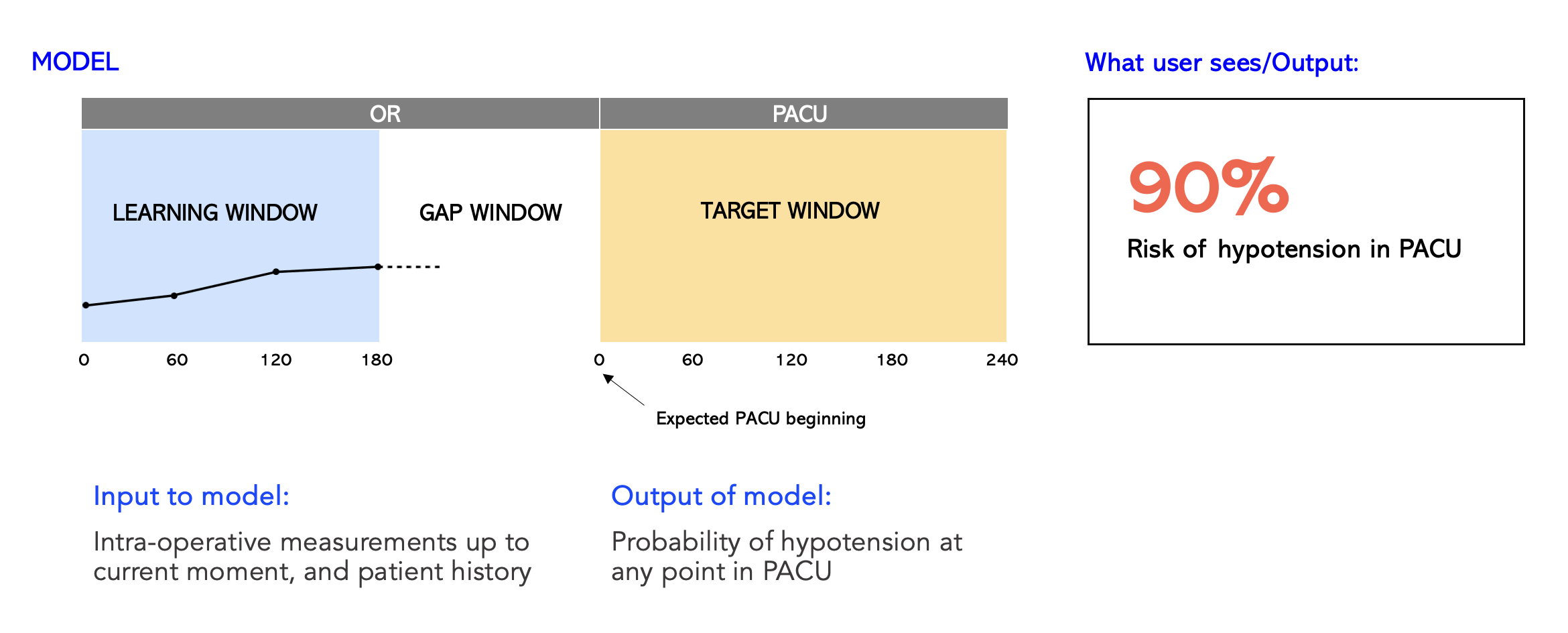 What we wanted to do is produce a risk estimate for hypotension in the PACU using the information from the OR. This becomes the learning window and the input to the model. Then there is a gap and the entire duration of PACU stay becomes the target window. The overall ML challenge is then a classification task. Given what the model has seen so far, will this patient become hypotensive or not? ๐ค