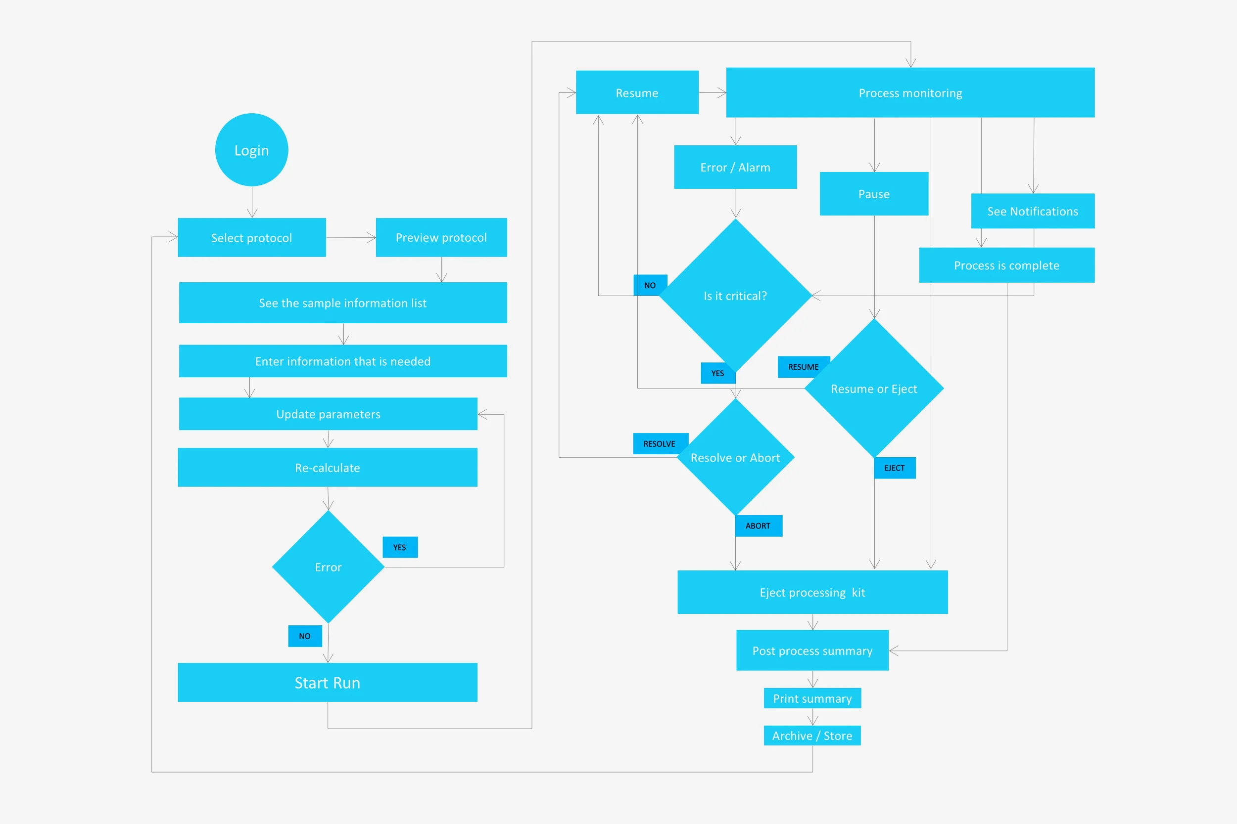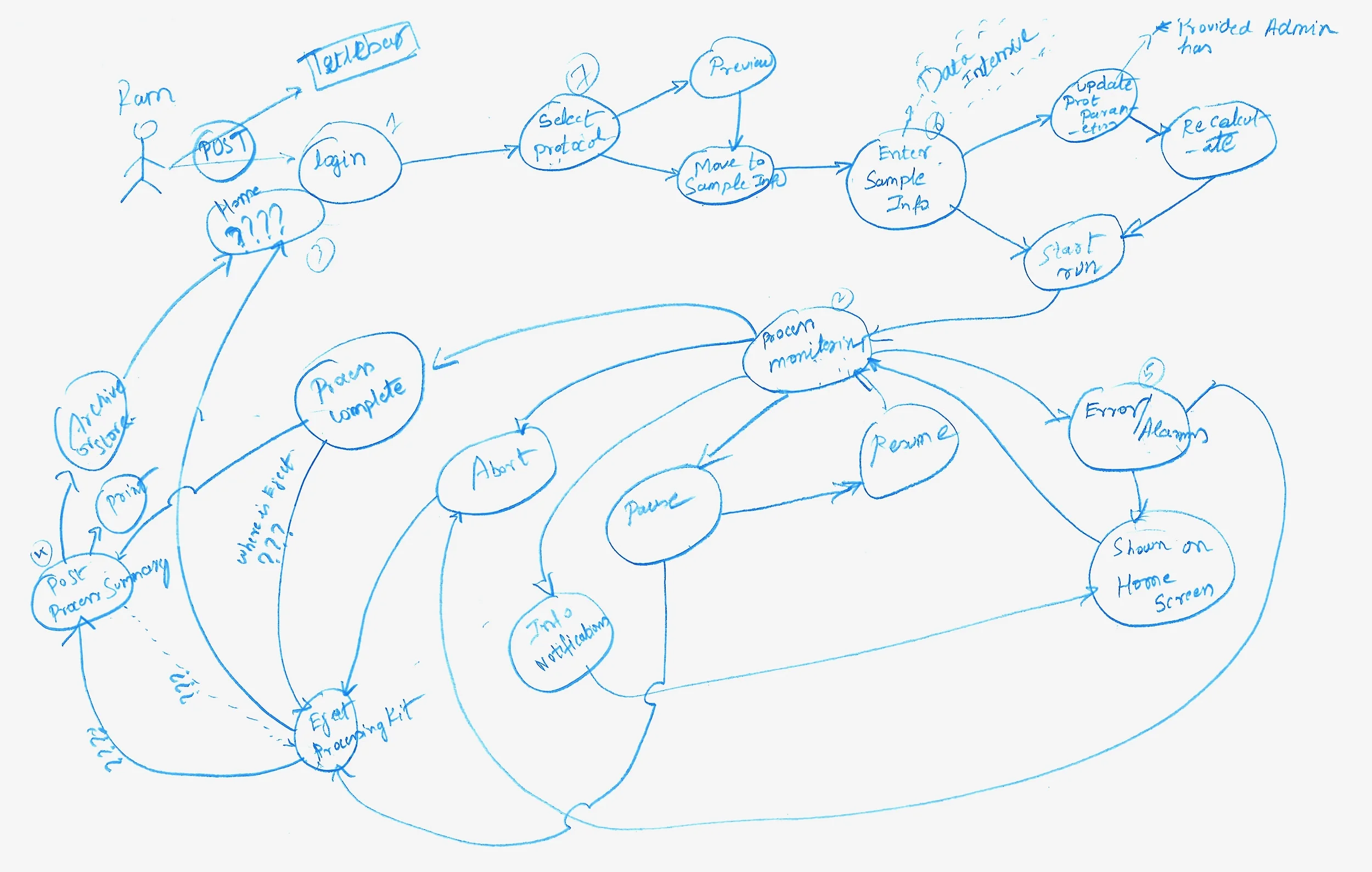 As the lead Interaction Designer on the project I had to start by talking to scientists and understanding their existing manual methods and protocols. Concept sketches and paper prototypes were further created and tested with the users. I also conducted extensive workshops with HW/SW engineers, managers and end users to reach a holistic design solution. I developed animated interactive prototypes on flash and tested them on an iPad. From deciding the screen type to working out the behaviour of the tiniest button; every decision was sensitively conceived, tested, iterated and realised. Understanding manual procedures, task-flows, system architecture and translating them into wireframes is super duper fun and I dig doing it. Take a look at some of the key stages of the design process below.