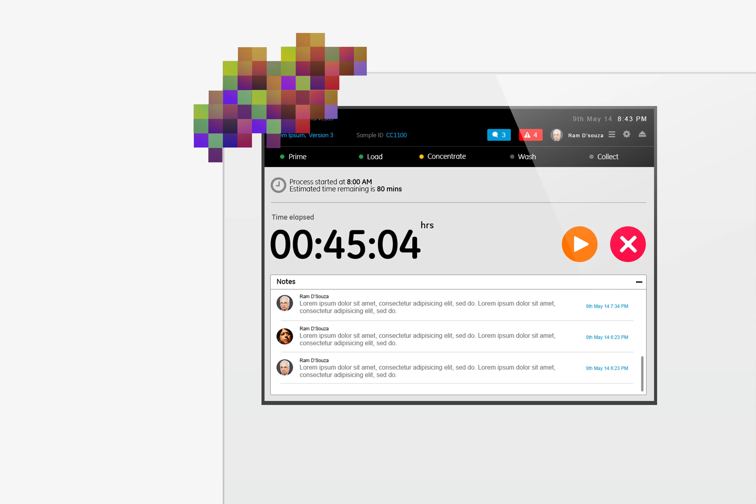 Users in a lab environment run tests that can go upto hours. Each basic user runs multiple tests and is expected to keep track of all tests simultaneously. Although, in an automated system, at any given point of time there is only a certain kind of information that needs to be shown on the screen. Alarms and notifications on the other hand must demand attention based on priorities. The above screens are examples of a state where in the user is seated in front of the system. Key tasks such as Run and Stop have been given more affordance as is the key information that is Time elapsed/Time left. All other information and action items are categorised and stored accordingly.