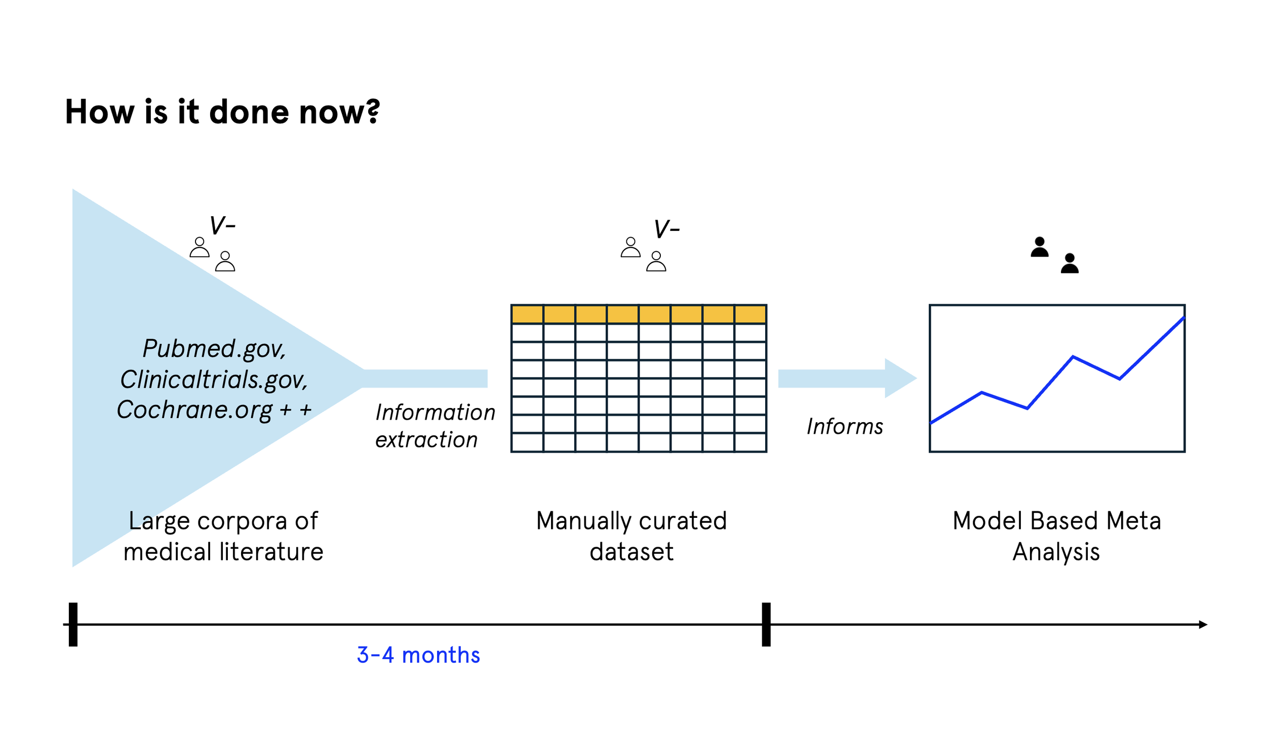 Most of the time is spent in the middle. Extracting and standardising data, and checking its quality, is slow, detailed work. A single meta analysis might involve 20 to 50 papers, with each one taking several hours to process. It requires deep expertise, but the work itself follows fairly consistent patterns.
